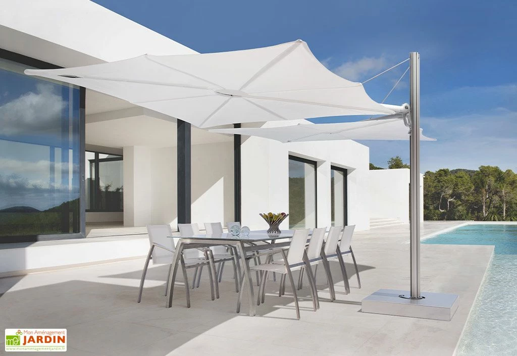 Le parasol Spectra Duo fabriqué par Umbrosa en Belgique est équipé de 2 grandes toiles carrées de 250 cm de côté.