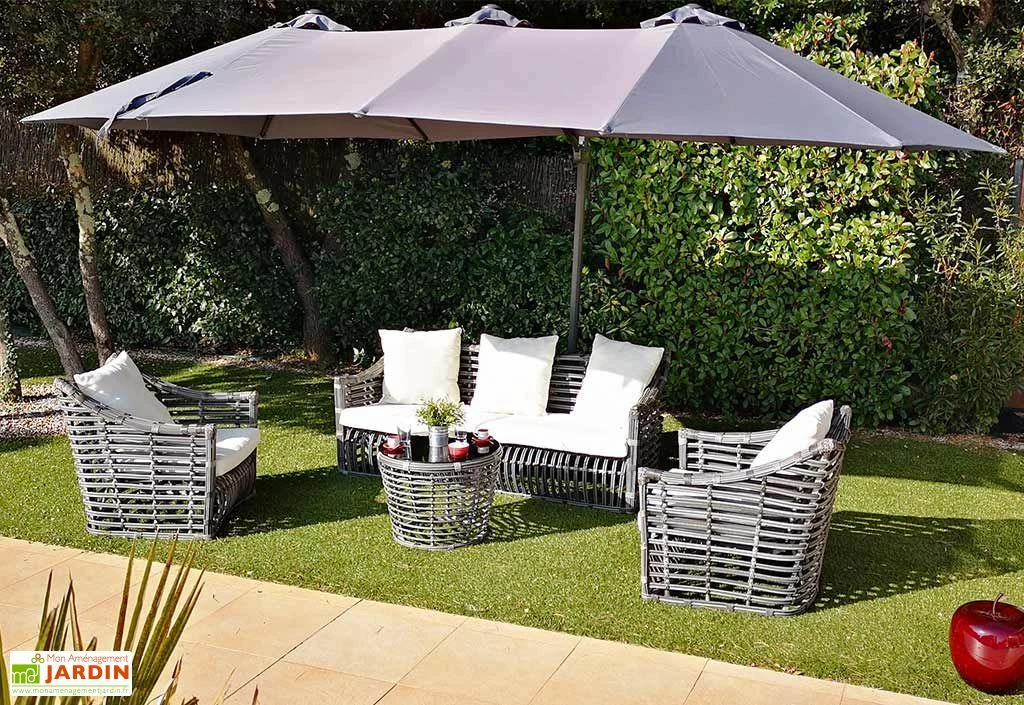 Le parasol bénéficie d’une très grande dimension permettant de couvrir un grand salon de jardin par exemple. Il est déporté et dispose d’une platine tournante à 360° permettant de suivre la course du soleil tout au long de la journée. Cette grande toile est supportée par 3 têtes équipées de 12 baleines de 12 x 18 mm de section.