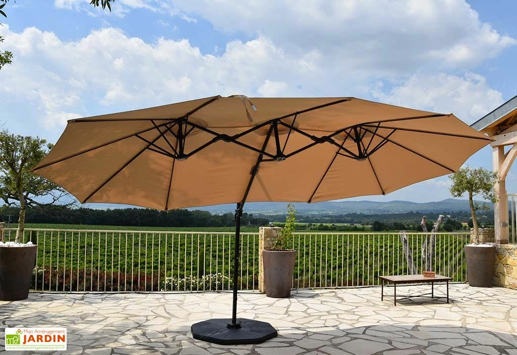 Le parasol déporté de chez Givex est un grand parasol composé de 3 têtes qui mesure 4,60 m de longueur totale.