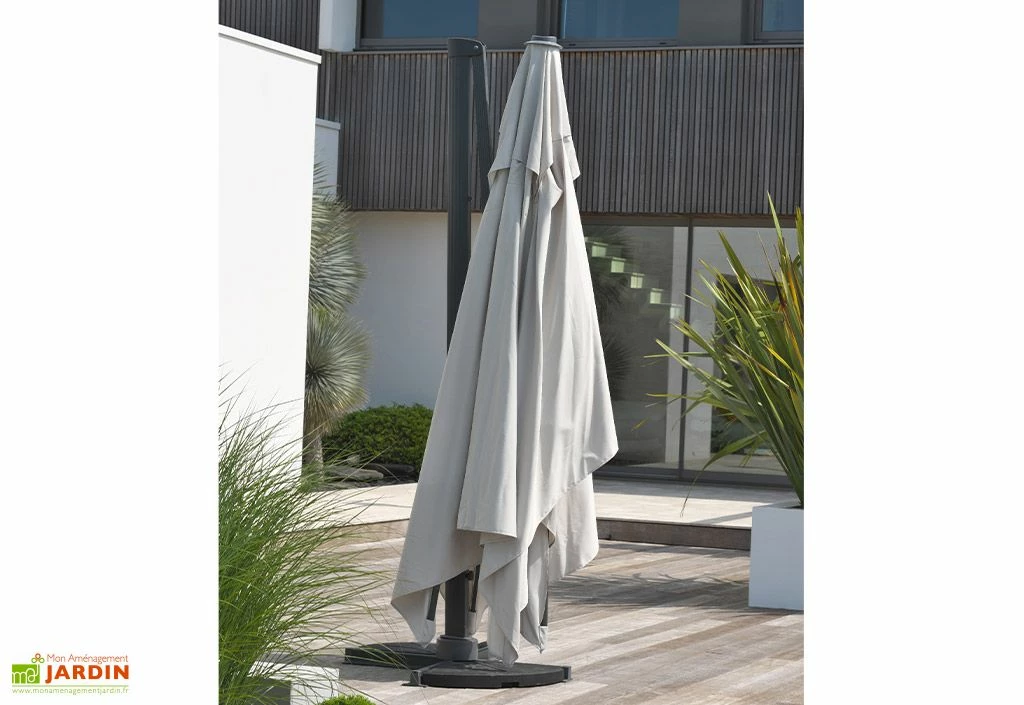 Le parasol de chez DCB Garden dispose d’une armature en aluminium et d’une toile en polyester. La toile mesure 4 m de longueur et 3 m de largeur. Elle est imperméabilisée et dispose d’une épaisseur de 230 gr/m2. Le parasol gris est déporté pour créer une ombre importante. Le pied en acier est rotatif ce qui vous permet de l’orienter facilement dans la direction voulue. La garantie est de 2 ans.