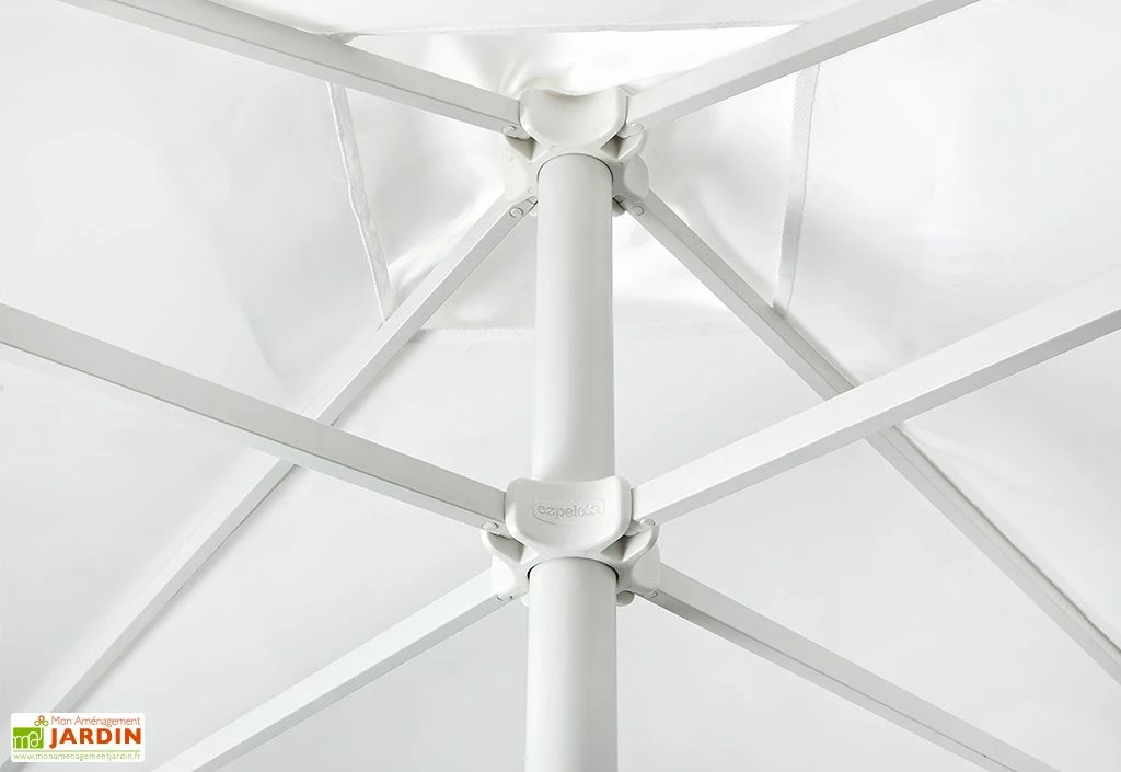 Le mât de ce parasol droit de 4,8 cm de diamètre est fabriqué en aluminium laqué, ce qui le rend insensible à la corrosion. Les baleines sont en acier, matériau plus lourd que l’aluminium, qui procure à l’ensemble du parasol une solidité et une stabilité face au vent de 90 km/h, mais aussi une résistance au chaud et au froid.