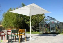 Différents coloris vous sont proposés pour ce modèle (blanc, gris anthracite et taupe). Ce parasol de jardin est livré directement monté et est garanti 2 ans.