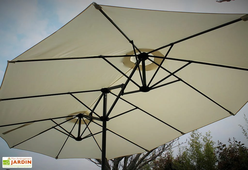 Le parasol dispose d’un mat droit en aluminium de 48 mm de diamètre. Résistant, l’aluminium ne craint pas la corrosion et ne demande donc aucun entretien. 12 baleines permettent de supporter les 3 têtes de parasol et d’assurer leur solidité. Elles mesurent 12 x 18 mm de section.