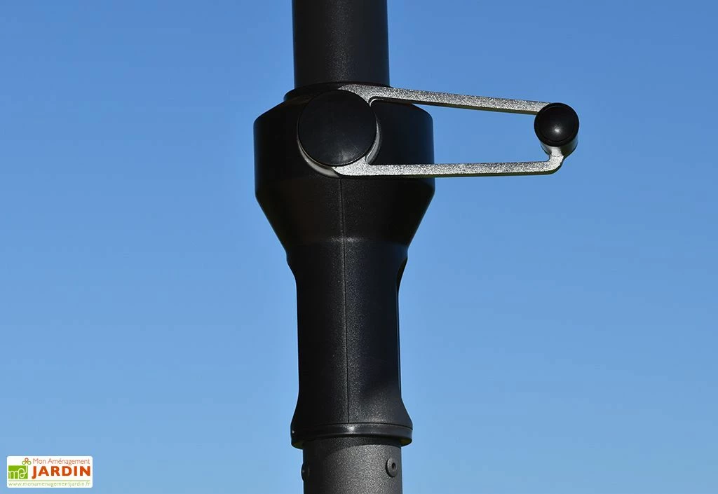 Le parasol Givex est équipé de 3 têtes qui lui offrent une longueur de 4,60 m pour une largeur de 2,70 m. Ses grandes dimensions lui permettent de couvrir une grande surface, en limitant l’espace qu’il occupe puisqu’il ne dispose que d’un seul pied.