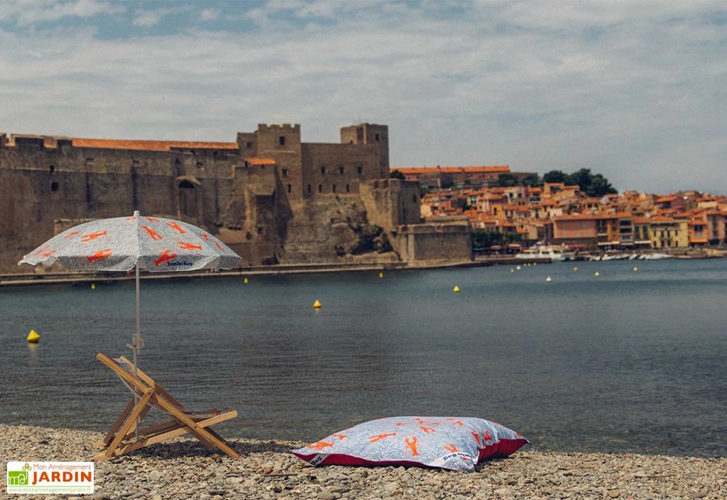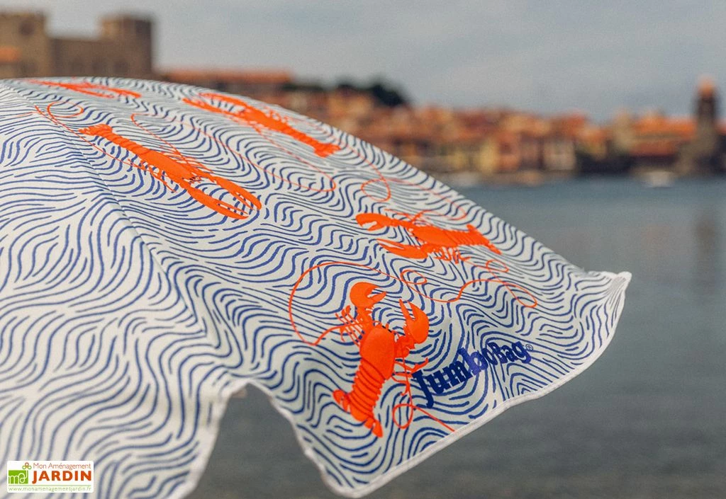 Le parasol de plage Lobster vous est proposé par Jumbo Bag. Il se compose d’une large toile de 167 cm de diamètre qui est en polyester et traitée contre les UV. Elle vous protégera des UV allant jusqu’à l’indice 50. Pour plus de stabilité, son armature est en acier et en métal. Notez, que le pied n’est pas inclus.