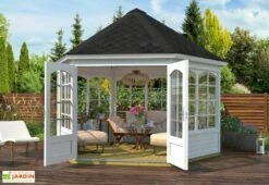 Entièrement conçu en épicéa, ce pavillon de jardin possède des parois de 19 mm d’épaisseur. Le bois utilisé est brut, donc non traité, ce qui signifie qu’il vous faudra le protéger contre les insectes, l’humidité et la moisissure. Vous pourrez également le peindre si souhaité. Notez par ailleurs que ce bois est certifié FSC, ce qui indique qu’il provient de forêts gérées dans le respect de l’environnement.