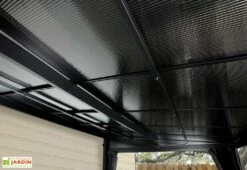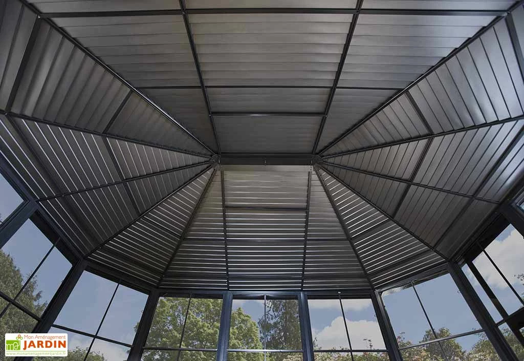Ce gazebo est doté de parois en aluminium et d’une toiture en acier galvanisé chargée de vous offrir un peu d’ombre les jours d’été, mais aussi un abri en cas de pluie. L’inclinaison de cette toiture permettra d’ailleurs d’assurer le bon écoulement des eaux pluviales pendant une averse. L’aluminium et l’acier galvanisé sont des matériaux intéressants puisque robustes et insensibles à la corrosion, même sans traitement ni entretien. Même la visserie est en inox, ce qui signifie que l’ensemble de la structure pourra passer l’hiver dehors sans craindre la rouille.