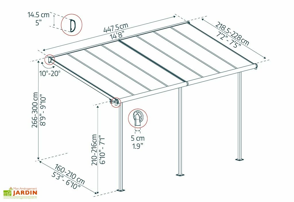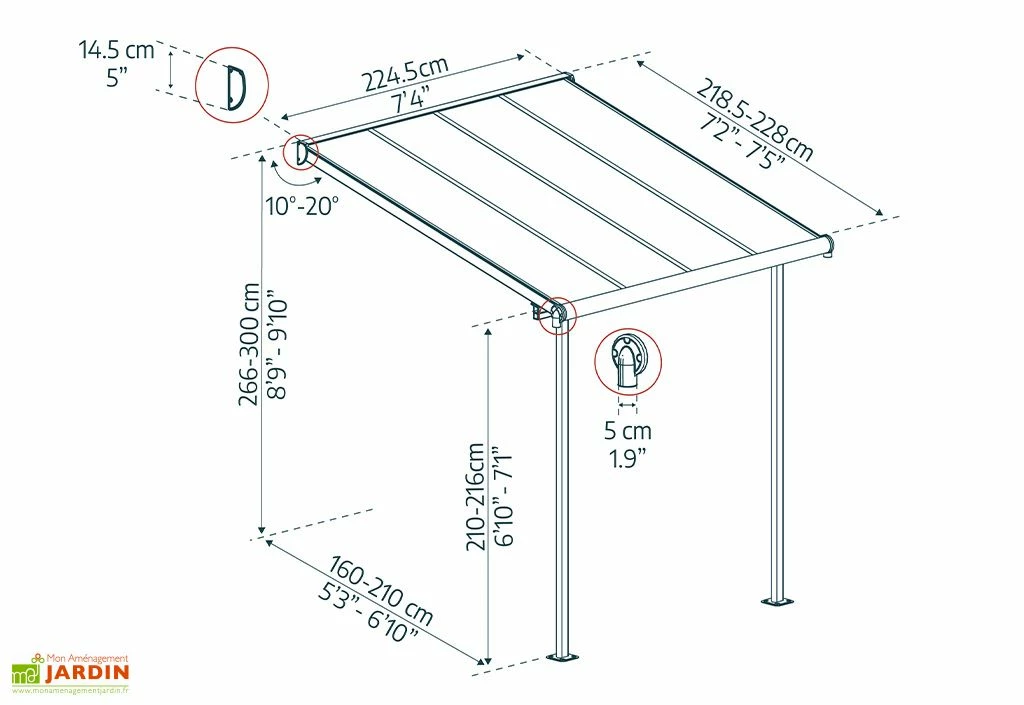 Cette pergola en aluminium est réglable en profondeur et en hauteur pour s’adapter à la configuration de votre terrasse. Vous pouvez ainsi choisir sa hauteur côté mur entre 266 et 300 cm et la profondeur de ses poteaux par rapport au mur entre 160 et 210 cm. Vous pouvez choisir sa largeur entre 3 modèles : 224,5 cm, 447,5 cm ou 670,5 cm. Ce sont la hauteur et la profondeur d’installation choisies qui détermineront la pente de la toiture, entre 10 et 20°.
