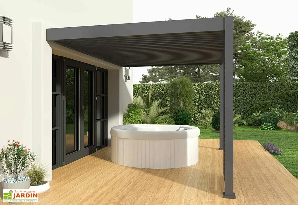 Cette pergola adossée mesure 3,97 m de longueur, 3,04 m de profondeur et 2,56 m de hauteur. Elle est équipée de 2 poteaux de 11,6 x 11,6 cm de section de poutres de 15,3 x 7,5 cm. Sa structure en aluminium est insensible à la rouille et couverte d’une peinture gris anthracite RAL 7015.