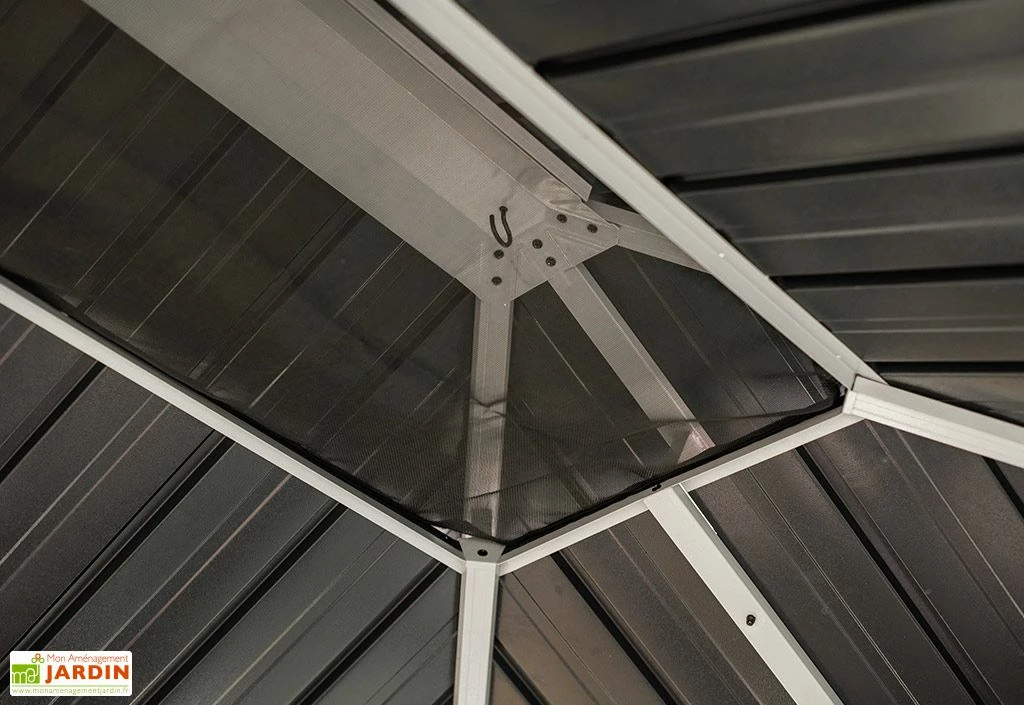 Sa toiture, équipée d’un double toit, permet d’assurer l’aération à l’intérieur de l’abri. Elle possède une excellente résistance à la neige, en pouvant supporter une charge de 150 kg/m². La tonnelle comprend également des moustiquaires renforcées d’aluminium et des fenêtres en PVC.