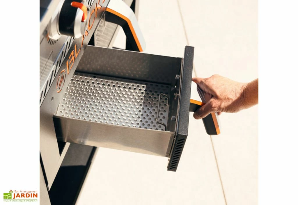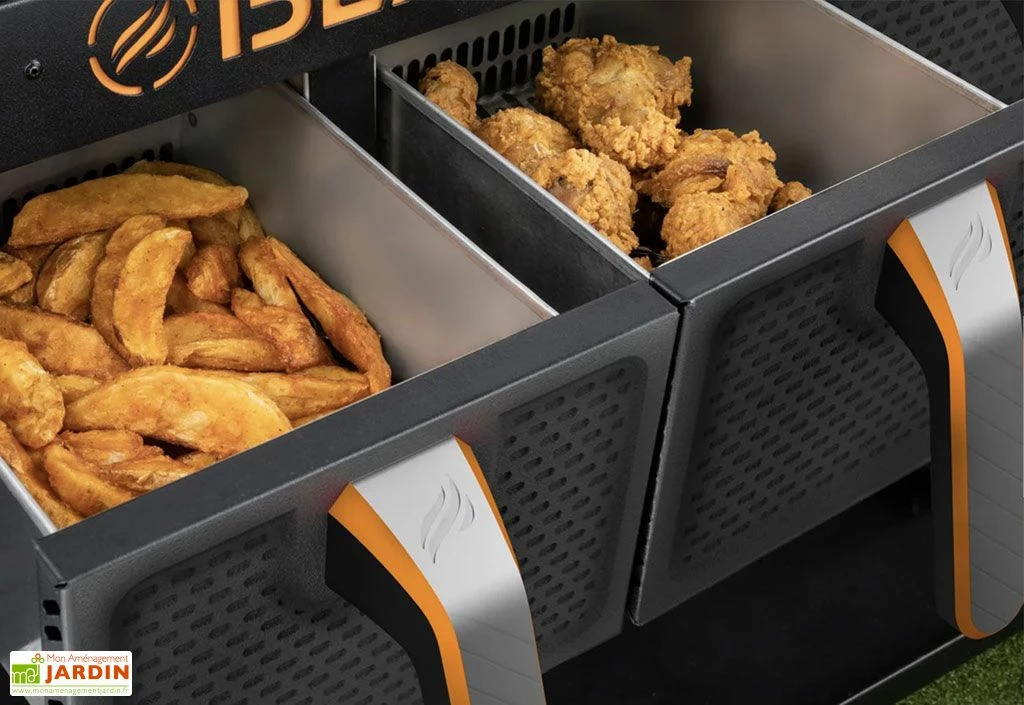 Pour accompagner cette plancha, la marque a équipé son chariot d’une friteuse à air électrique et d’un tiroir permettant de garder bien au chaud les aliments venant d’être frits. Chaque tiroir possède une capacité de 4 L et la friteuse air fryer vous permettra de cuisiner frites, beignets ou poissons frits en n’utilisant qu’un minimum d’huile, pour des cuissons bien moins grasses mais tout aussi délicieuses !