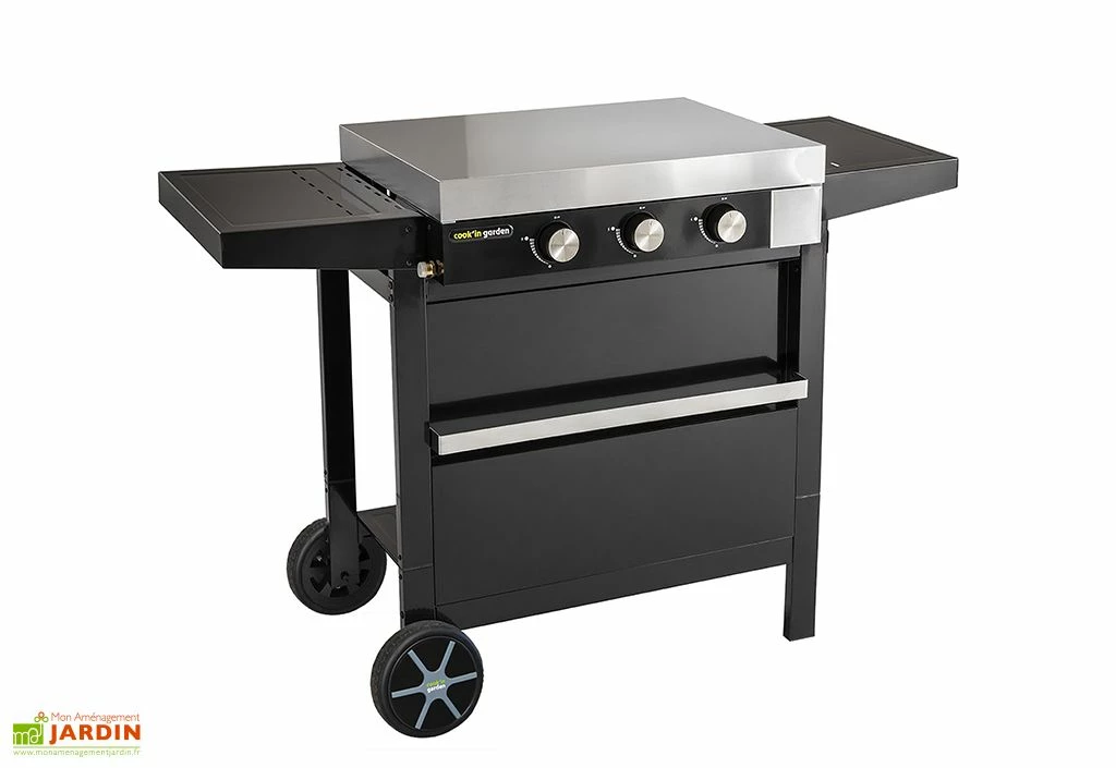 Parfait pour cuisiner pour une dizaine de convives, cette plancha à gaz Finesta de chez Cook’in Garden est installée sur un chariot tout en métal qui permet de la déplacer facilement grâce à ses deux roues renforcées. Elle affiche des dimensions de 124 x 57 cm, pour 87 cm de haut et dispose d’une surface de cuisson de 61 x 42 cm.