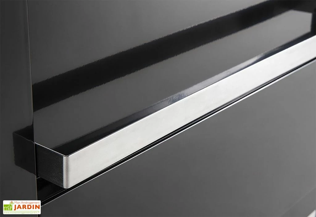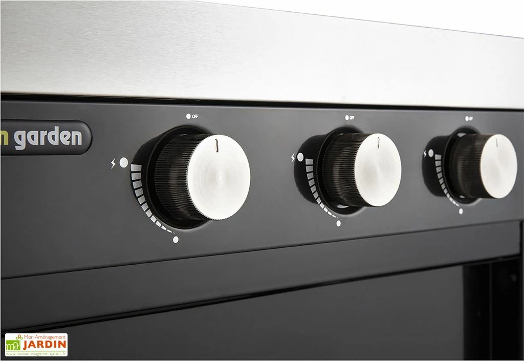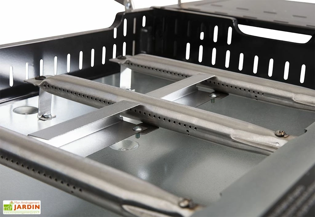 Une plaque en fonte émaillée installée sur le barbecue à gaz permet de cuire tous les types d’aliments en toute sécurité grâce à ses bords relevés. Juste en dessous de cette plaque se trouve un bac récupérateur de graisse avec un tiroir en inox d’une capacité de 350 L qui facilitera le nettoyage de la cuisine extérieure.