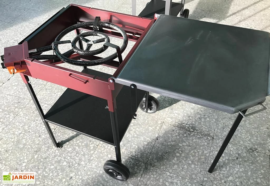 Cette plaque est amovible et dissimule d’ailleurs un fourneau pensé pour accueillir une poêle d’un diamètre de 55 cm maximum. Une fois levée, elle pourra reposer sur le pied d’appui fourni et ainsi être utilisée comme plateau pendant l’utilisation du fourneau.