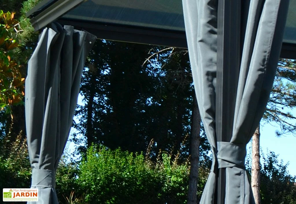 Les 4 rideaux s’installent sur la pergola bioclimatique Gaïa de chez Couleurs du Monde. Ils vous protègent contre le soleil, les regards indiscrets et une légère brise. Ces rideaux sont en polyester gris et possèdent une épaisseur de 180 gr/m².