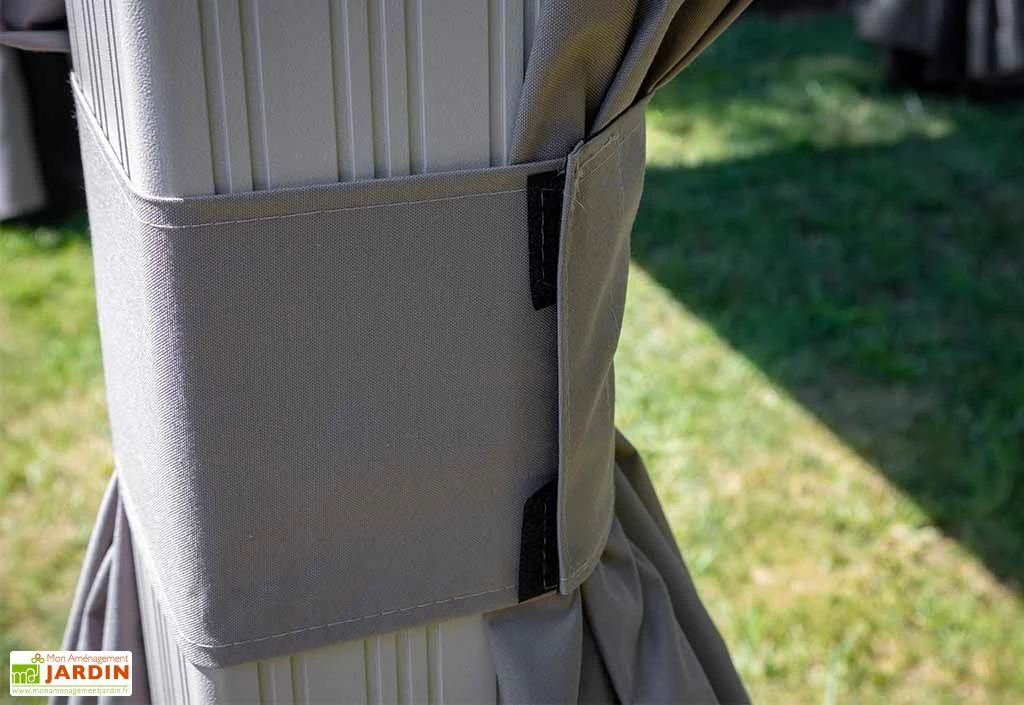 Ces rideaux sont dotés d’entrées à fermetures éclair qui vous permettront de pénétrer facilement au sein de votre tonnelle. Ils pourront ensuite être facilement attachés aux poteaux de la structure afin de les maintenir en position ouverte. Des clips de fixation vous seront fournis.