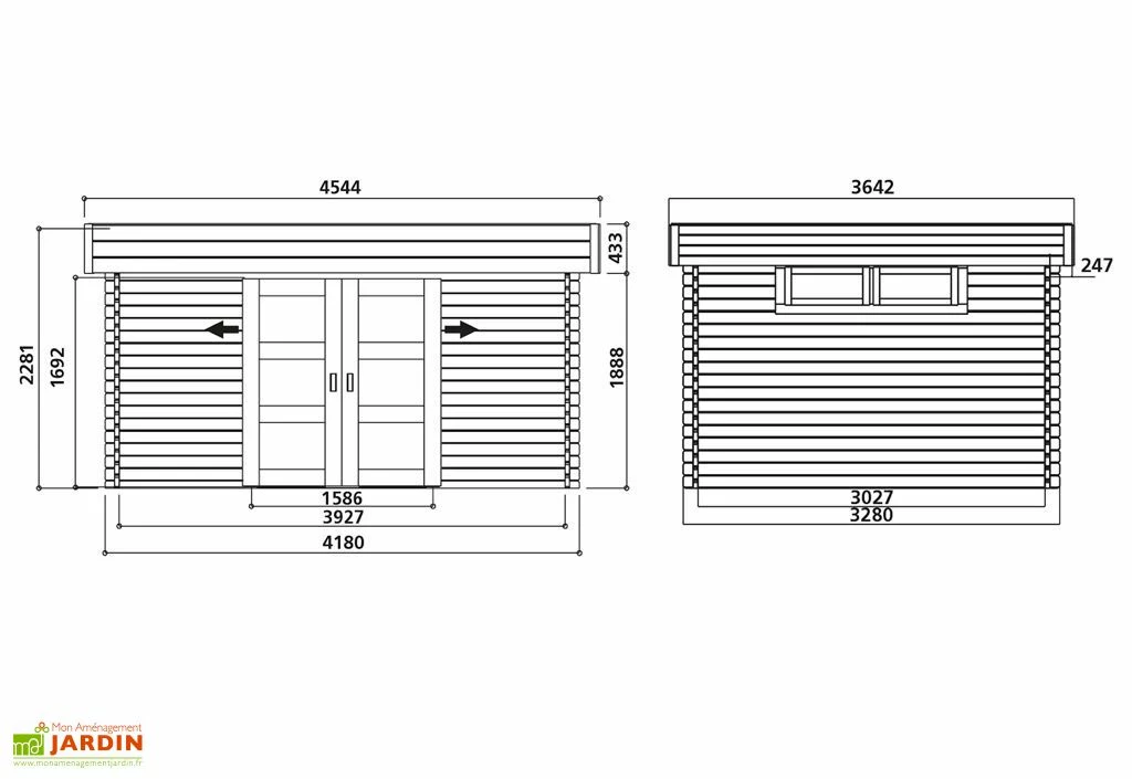 Le chalet en bois a une surface utile de 392,7 x 302,7 cm, soit 11,89 m². La hauteur de gouttière s’élève à 188,8 cm. L’abri doit être disposé sur une dalle en béton de 418 x 328 cm. Il se monte facilement avec son système Place & Plug d’emboitement de profilés à languettes et rainures.