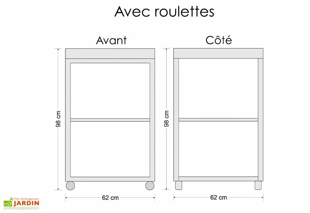 Ce chariot mesure 62 cm de côté et comprend 3 étagères. Il est livré avec 4 roulettes pour vous permettre de le déplacer facilement. Vous pouvez également choisir d’installer les pieds réglables en hauteur, inclus. La hauteur du chariot passe de 92 cm avec les pieds à 98 cm avec les roulettes.