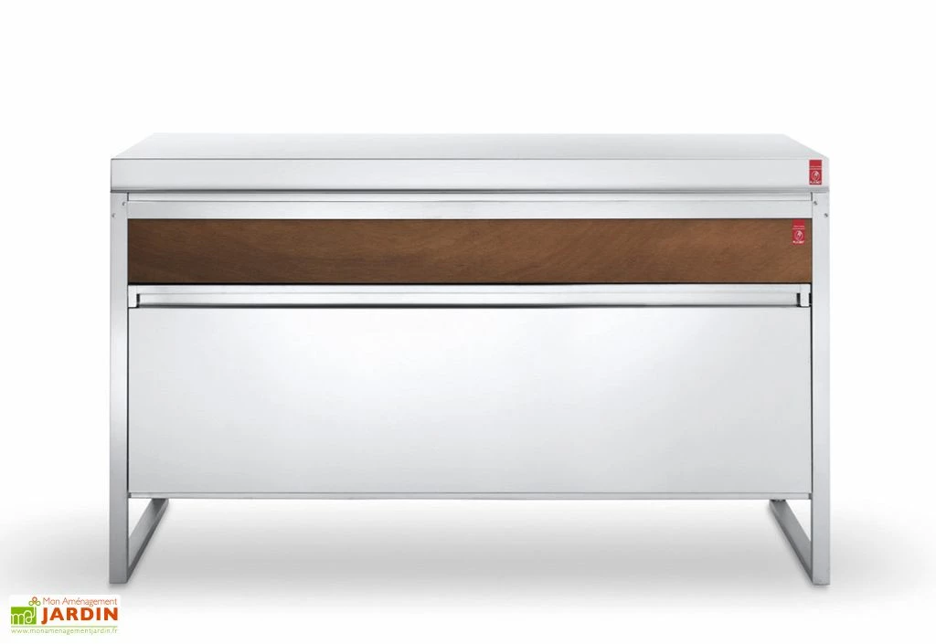 Fabriquée à partir de matériaux robustes, cette table de cuisson témoignera d’une belle longévité. Elle est ainsi conçue en inox et en contreplaqué d’okoumé, un bois très résistant parfait pour l’extérieur. Le bois utilisé est par ailleurs certifié FSC, ce qui indique qu’il provient de forêts gérées de façon écoresponsable. Le tout mesure 142 cm de long, pour 56 cm de profondeur et 88 cm de haut, et le meuble vous sera livré déjà monté, accompagné d’un couvercle intégral. Notez enfin que cette table de cuisson intègre un grand placard, situé en façade, idéal pour le rangement de vos ustensiles de cuisine.