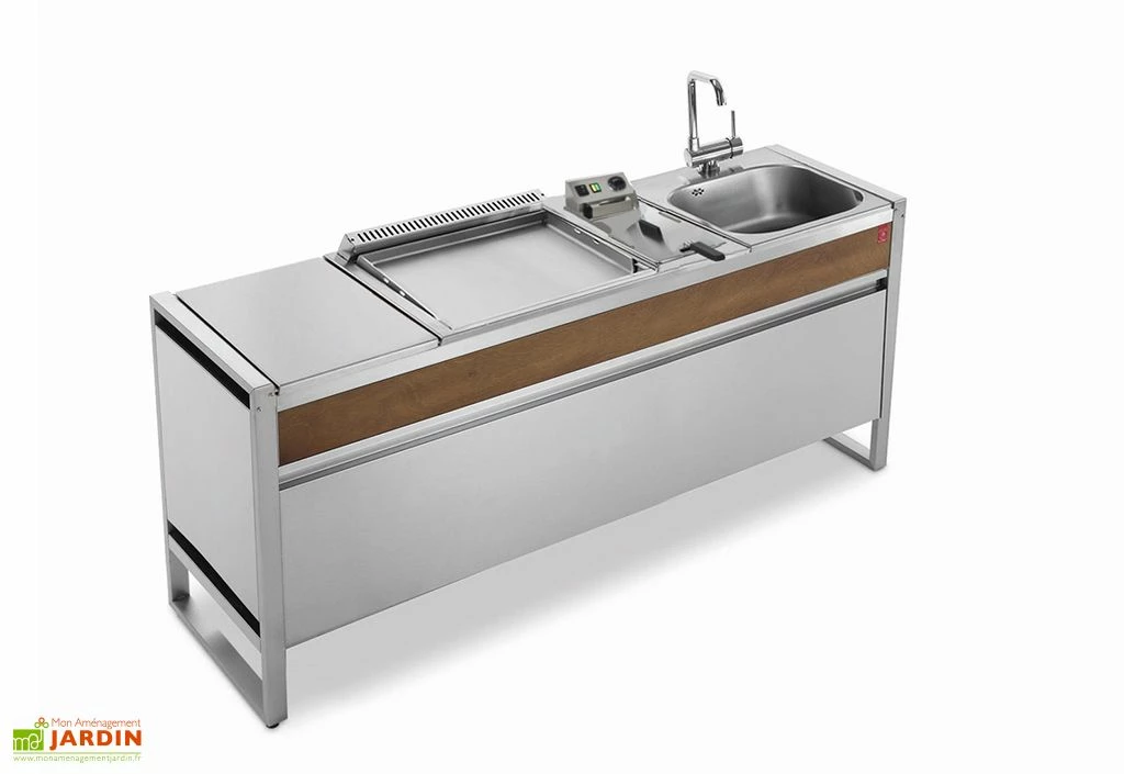Fabriquée par Pla.Net, la table de cuisson Oasi 205C affiche des dimensions de 205 cm de long sur 56 cm de profondeur, pour 88 cm de hauteur et fait un poids de 140 kg. Elle comprend une plancha à gaz, une friteuse électrique, un évier et un mitigeur pliable. La cuisine extérieure est conçue en inox, et intègre un panneau en contreplaqué de bois Okoumé certifié FSC. Ce sigle prouve que le bois utilisé provient de forêts gérées dans le respect de l’environnement.