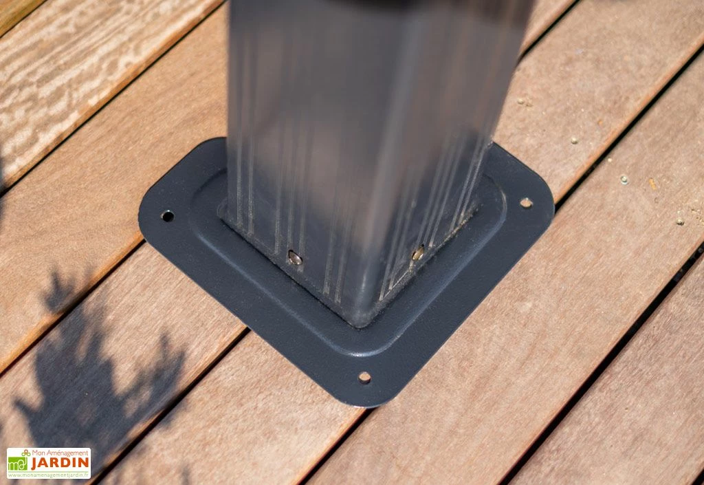 La pergola est livrée en kit et bénéficie d’un montage simple grâce à une notice détaillée pas à pas. Il est conseillé d’être deux lors de l’assemblage, qui vous prendra 5 à 6 heures maximum. Les platines des poteaux sont pourvues de 3 trous chacun. 12 vis et chevilles (non incluses) seront donc nécessaires pour ancrer solidement la structure.
