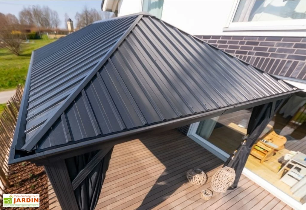 Ce grand pavillon de plus de 20 m² est soutenu par 6 poteaux de 12 x 12 cm de section, offrant une parfaite stabilité à la structure. Sa toiture en tôles d’acier électro-zingué, également résistante aux agressions, pourra supporter une lourde charge de neige, jusqu’à 150 kg/m².