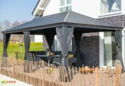 Cette tonnelle de jardin est équipée d’une gouttière pour réguler facilement l’écoulement de l’eau de pluie. Elle comprend également un set de moustiquaires en nylon pour profiter de la terrasse sans craindre les insectes. La structure étant dotée de rails à 2 voies vous pourrez y installer les moustiquaires incluses et des rideaux (non inclus) en même temps, sans avoir à choisir.