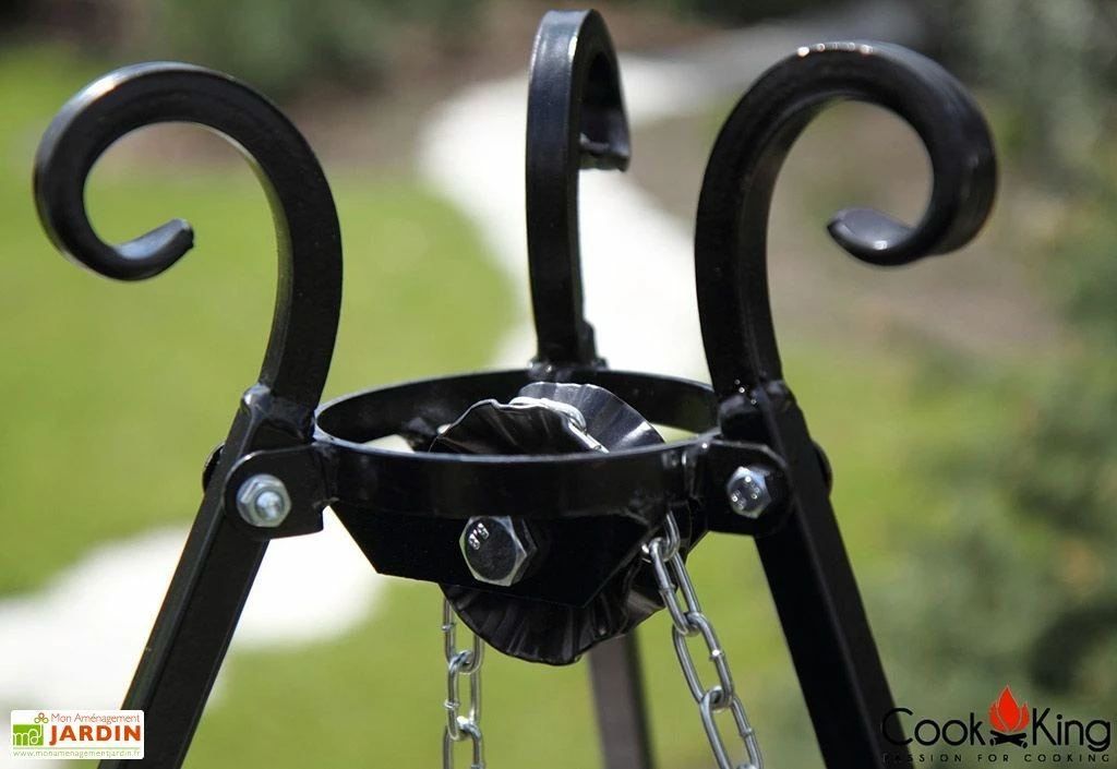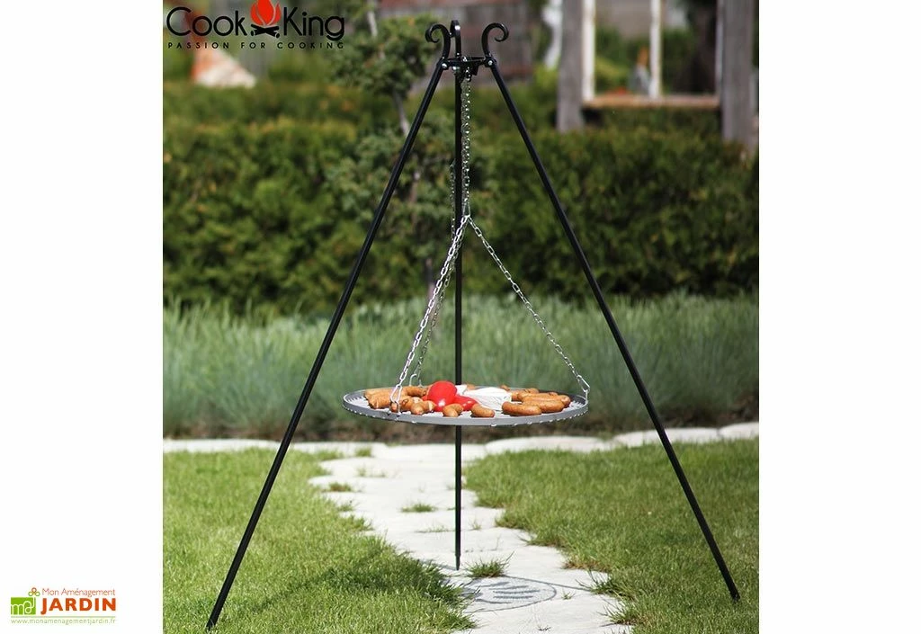 Le trépied de chez Cookking est livré avec sa grille de cuisson, disponible en plusieurs dimensions. L’ensemble vous permet de transformer votre braséro en véritable barbecue. La chaine incluse avec le trépied permet de régler facilement la hauteur de la grille sur le feu pour maitriser facilement la cuisson de vos grillades.